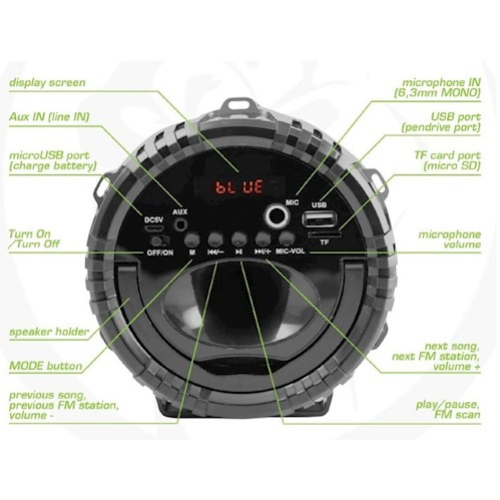 Frekvenčná odozva 25 Hz-18 kHz 5 multimediálnych tlačidiel má prepínač LED displej Komfortná zasúvateľná rukoväť na presun reproduktora rukoväte na popruhu Slot pre kartu microSD, z ktorej môžete prehrávať súbory mp3